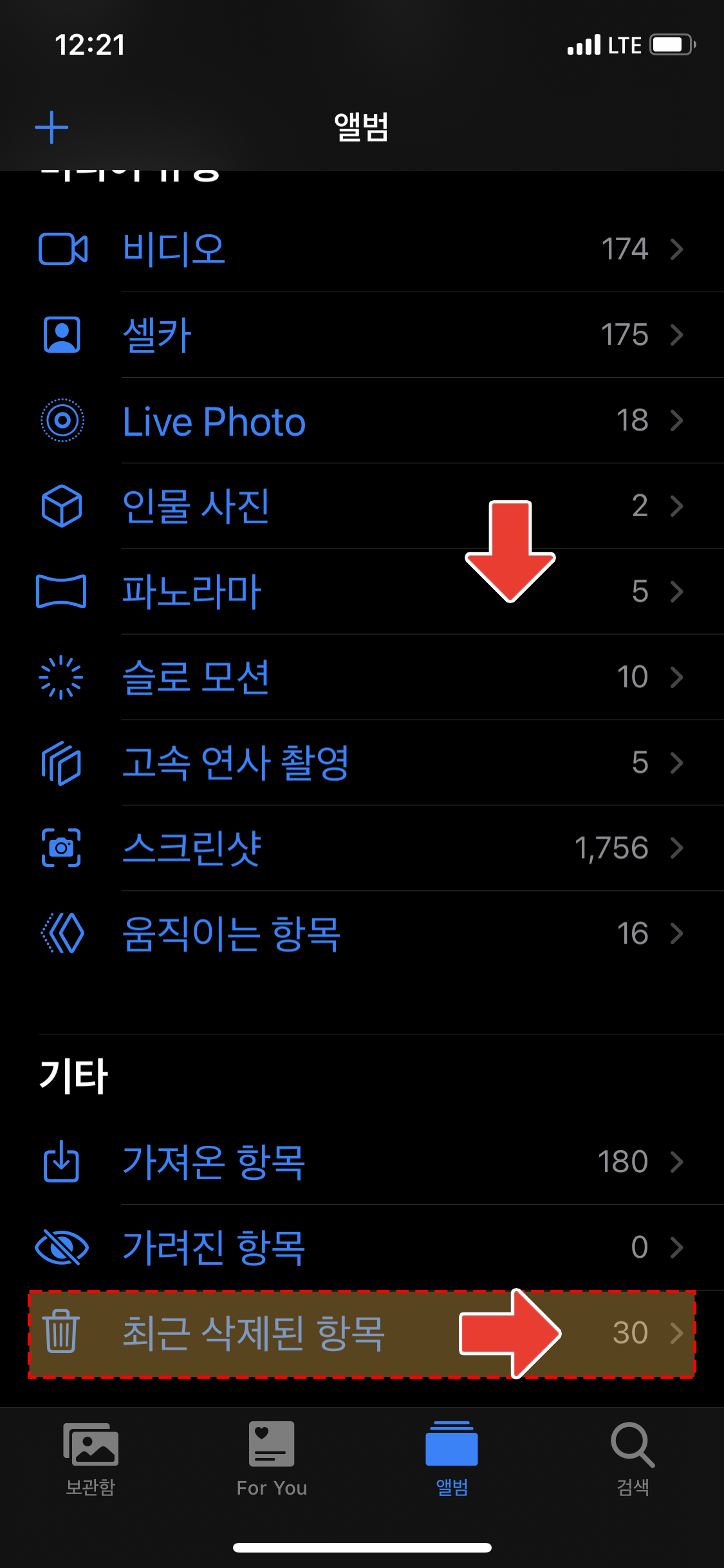 앨범 탭을 눌러 준 뒤에 맨 하단으로 내리다 보면 [최근 삭제된 항목]이라는 메뉴가 있고, 지금까지 아이폰에서 삭제한 사진들의 개수 또한 표기가 된답니다.