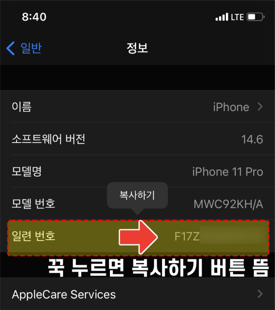 그러면 현재 여러분들이 사용하고 있는 아이폰의 이름, 소프트웨어 버전, 모델명, 모델번호, 일련번호 등이 뜨게 되는데 해당 일련번호 위치에서 꾹 누르게 되면 자동으로 일련번호가 복사 버튼이 뜬답니다.