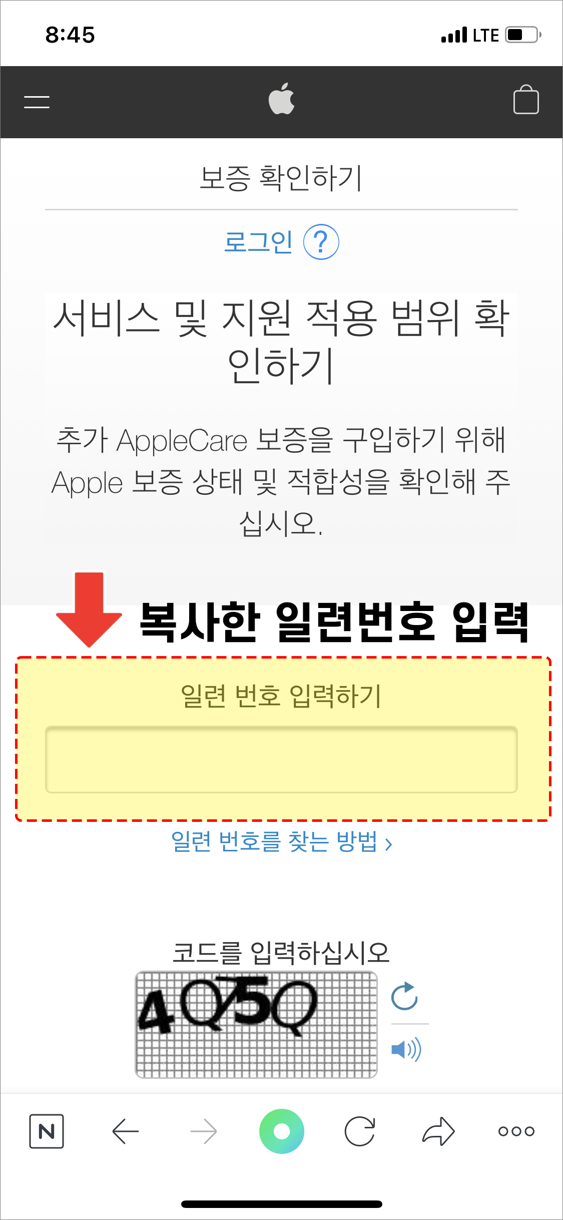그러면 Apple 제품의 서비스 및 지원 보증 확인하기 창이 뜨면서 클릭하게 되면 여러분들이 현재 사용하고 있는 아이폰 일련번호를 입력하는 란이 나옵니다.