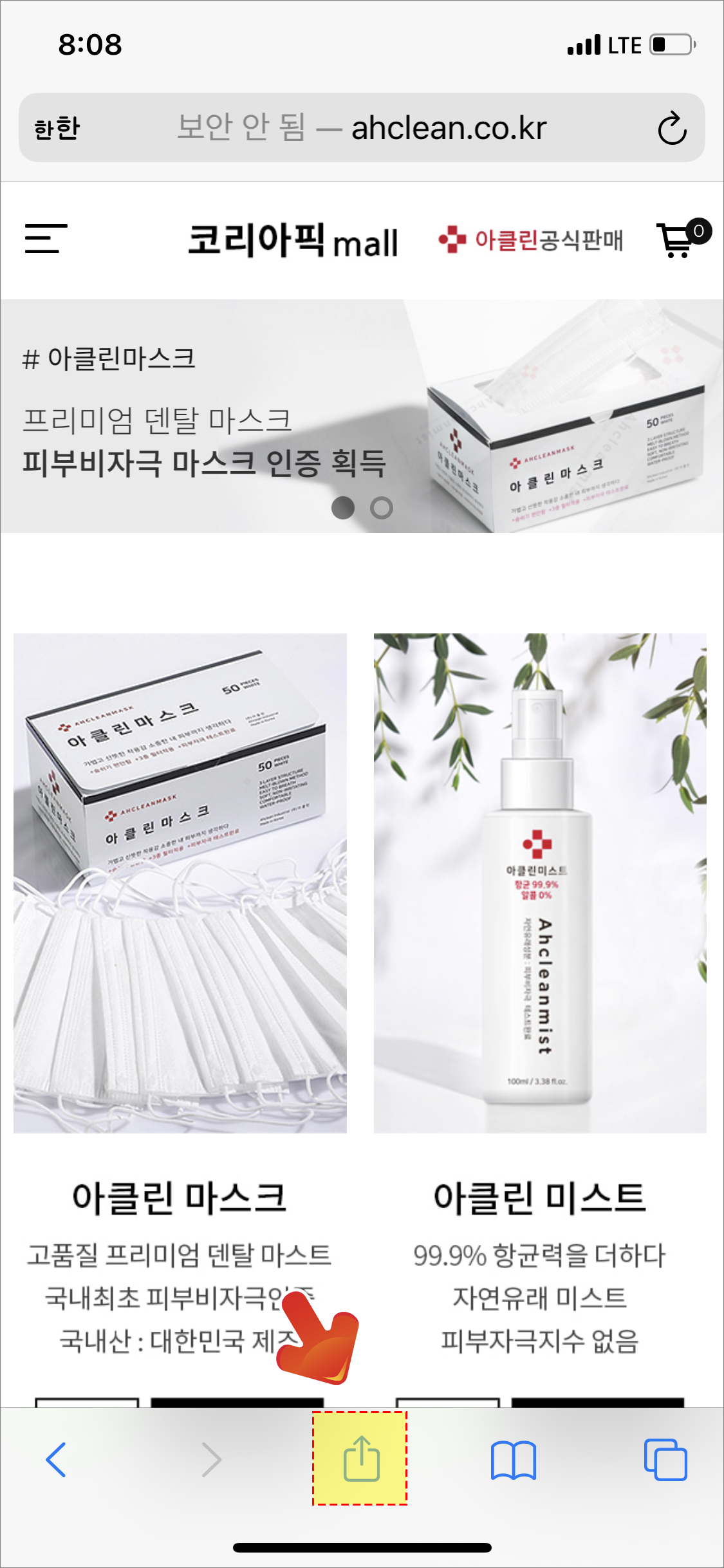 먼저 원하시는 사이트에 접속을 한 뒤에 사파리 하단에 있는 [공유하기] 버튼을 클릭하여 눌러 줍니다. 공유하기 버튼에는 책갈비부터 즐겨찾기, 복사하기, 다른 sns계정으로 연동하기 기능들이 들어 있답니다. 아이폰 사파리 즐겨찾기를 하기 위해서는 하단으로 좀더 드래그해서 내려 줍니다.