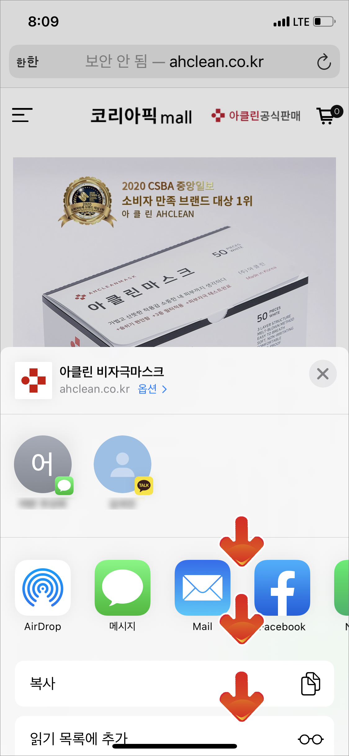 먼저 원하시는 사이트에 접속을 한 뒤에 사파리 하단에 있는 [공유하기] 버튼을 클릭하여 눌러 줍니다. 공유하기 버튼에는 책갈비부터 즐겨찾기, 복사하기, 다른 sns계정으로 연동하기 기능들이 들어 있답니다. 아이폰 사파리 즐겨찾기를 하기 위해서는 하단으로 좀더 드래그해서 내려 줍니다.