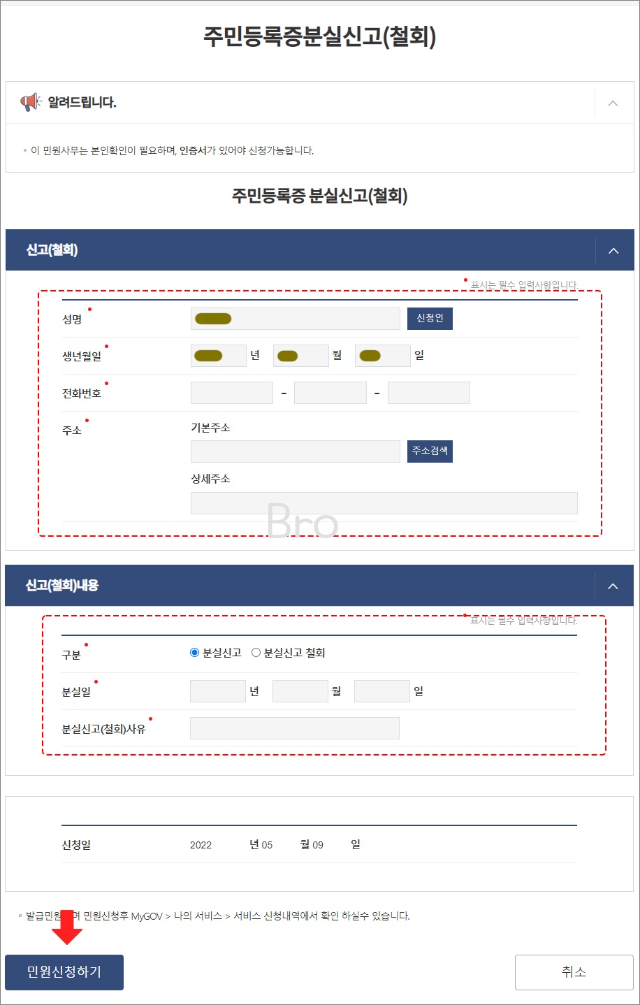 민증 잃어버렸을때 간혹 다음날 찾는 경우가 많은 경우 기존에 신고해 놓았던 것을 철회해야 하는 일이 생겼을 경우에는 같은 방법으로 민원24시에 접속을 하여 비회원으로 로그인하여 철회 정보와 내용들을 입력한 뒤에 민원신청하기를 하시면 된답니다.