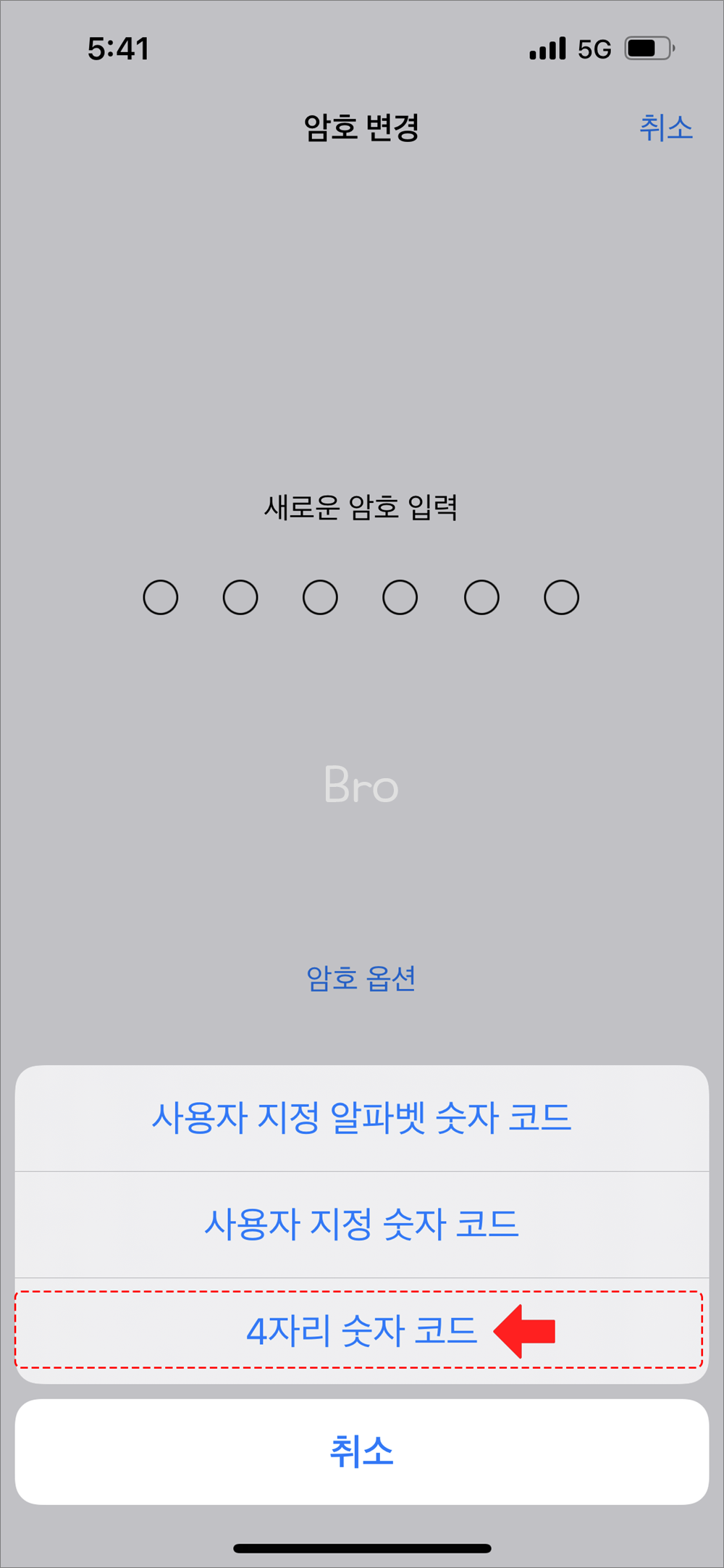 4. 암호 변경 > 암호 옵션 > 4자리 숫자 코드 선택