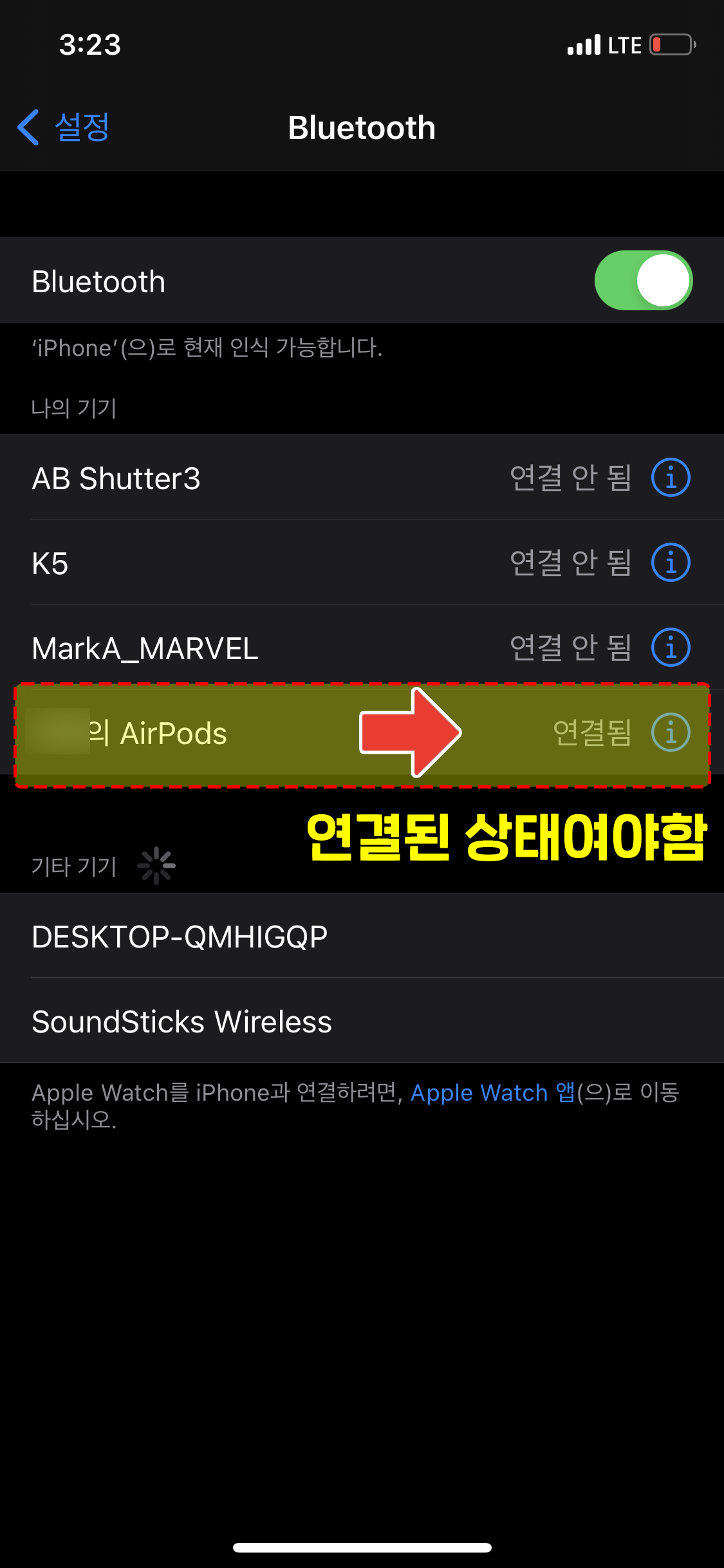 그리고 에어팟 이름을 바꾸기 위해서는 기본적으로 연결이 되어 있는 상태여야 합니다. 상호연결이 안되어 있으면 당연스럽게도 이름을 바꾸실 수가 없답니다.