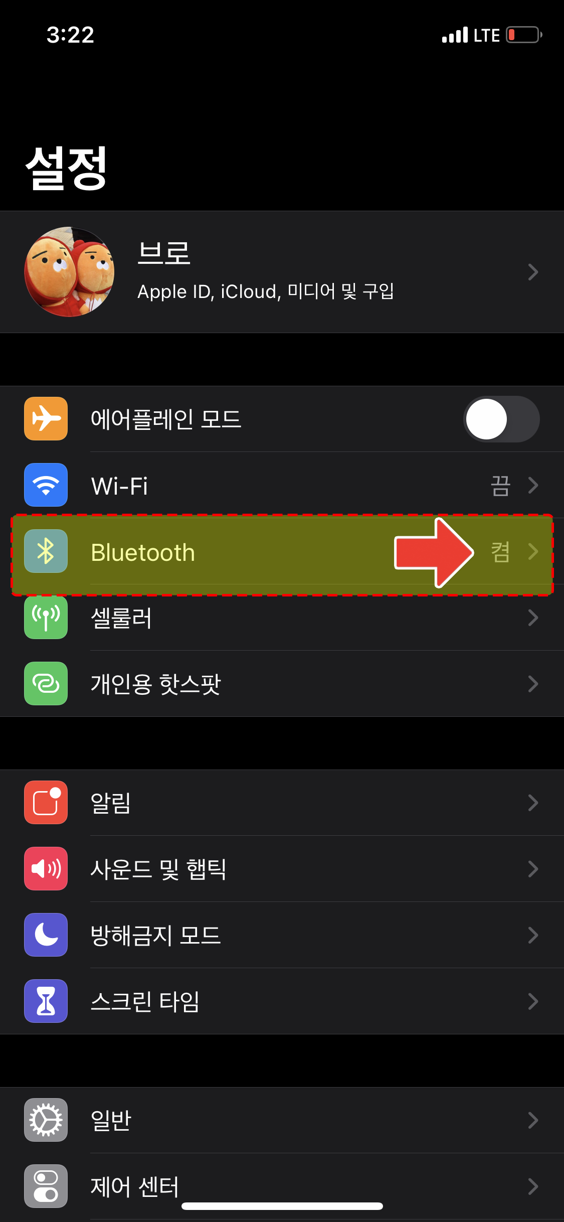 에어팟은 기본적으로 블루투스와 연결되어 있기 때문에 설정에 들어가신 후에 [Bluetooth] 메뉴에 들어가신 후에 보시면 현재 연결되어 있는 여러가지의 기기들이 있는데 보통은 [이름+AirPods]으로 설정되어 있답니다.