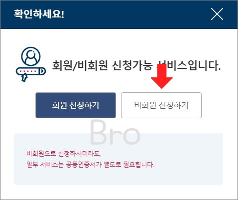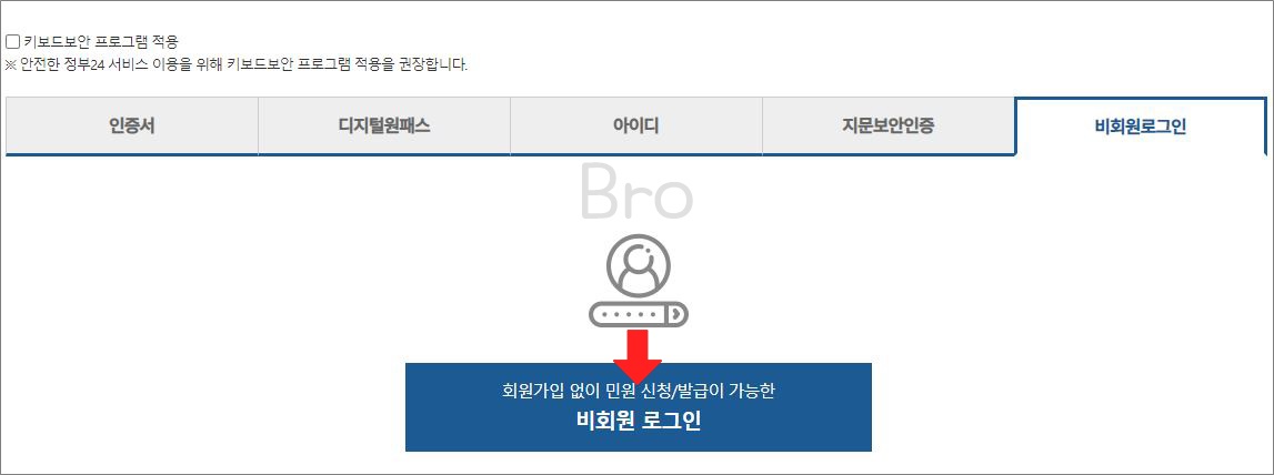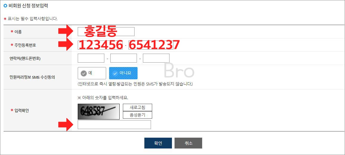 비회원으로 신청하는 경우에는 기본적으로 이름과 주민등록번호를 필요로 하게 됩니다.